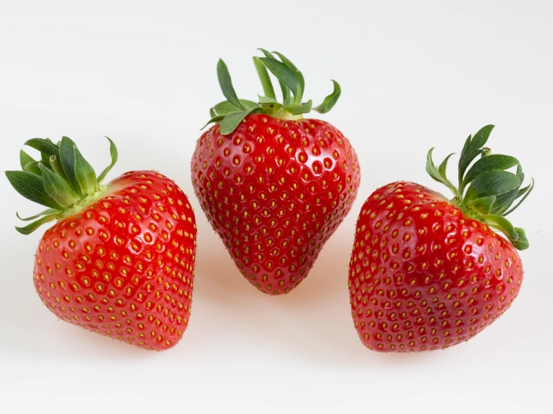 Owoce: Duże i średnie, jednolicie wybarwione o intensywnie błyszczącym czerwonym kolorze, dość soczyste, bardzo słodkie. Kształt kulisto-stożkowaty. Nasiona są zwykle lekko zagłębione. Jędrność jest zadowalająca, jeśli zbierzemy Rumbę w dobrych warunkach. Ich zaletą jest, że pozostają błyszczące przy dłuższym przechowywaniu. Średnia masa owoców i ogólna wydajność jest znacznie większa w porównaniu do odmiany Honeoye. Odmiana nadaje się do przyspieszania ( nawet o 7 dni ). Kolejną z zalet jest łatwość i szybkość zbioru, owoce są dobrze wyeksponowane.